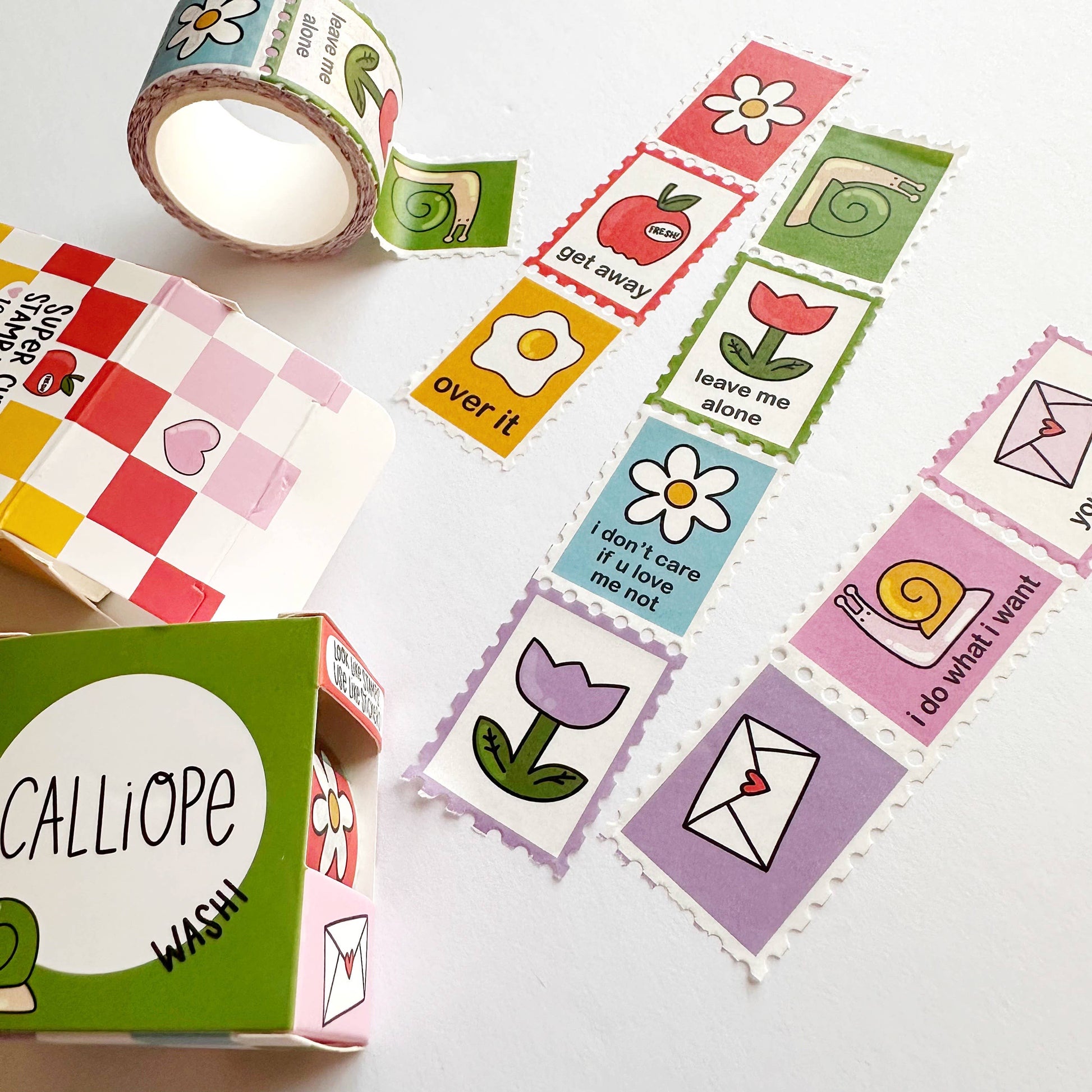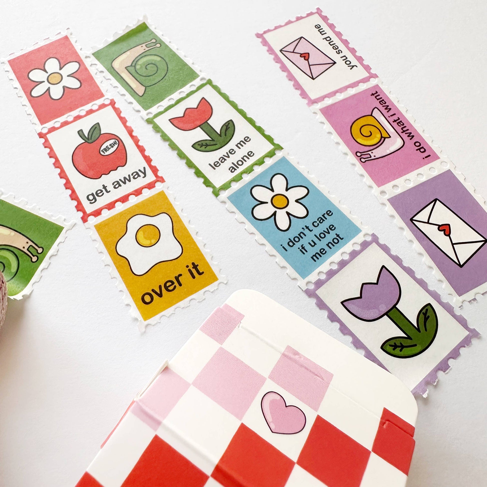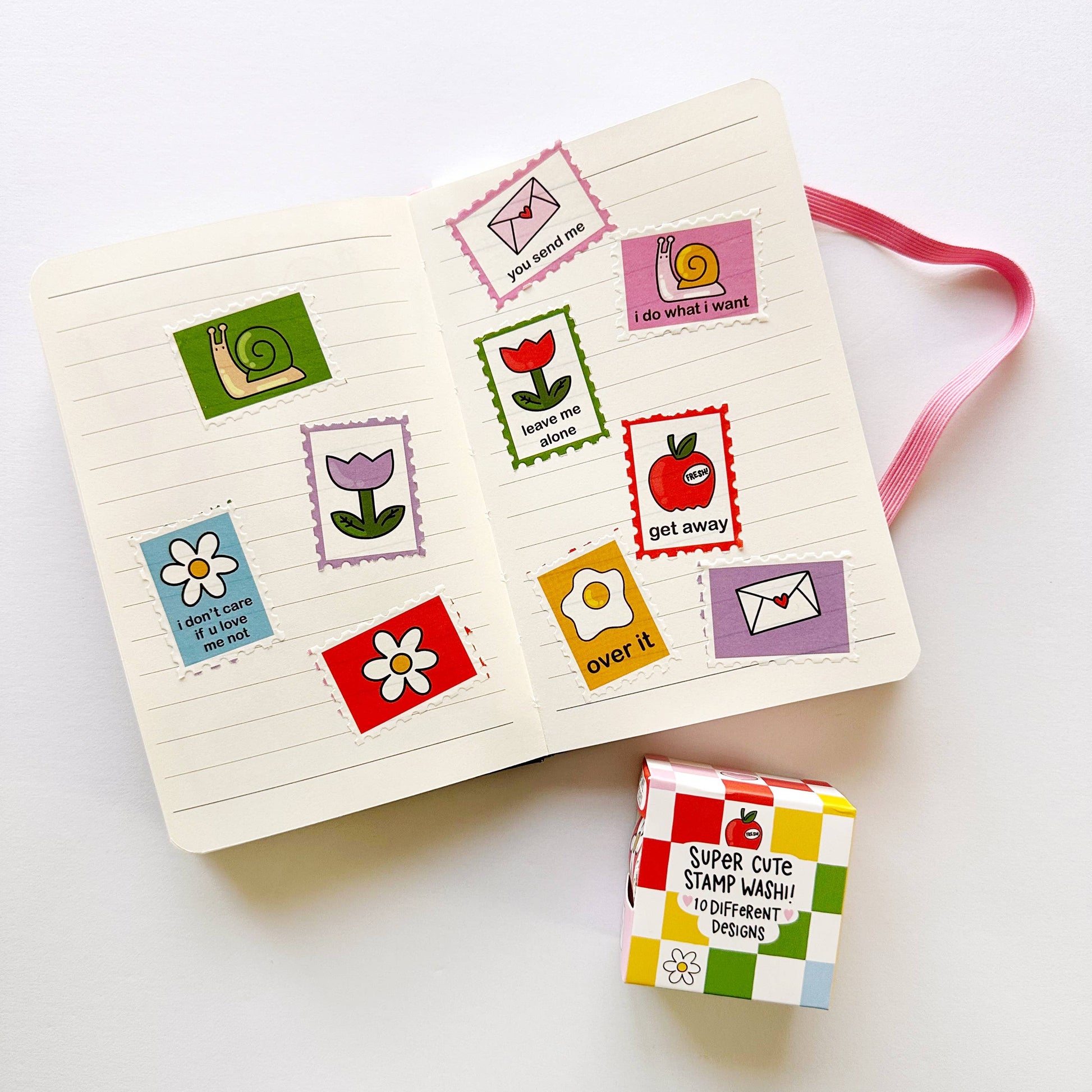 Stamp washi is like a tape/sticker hybrid and each little stamp tears off to mimic a real stamp! While they are not worth any postage, they look great next to the real thing and will go through the mail on your cards and letters!