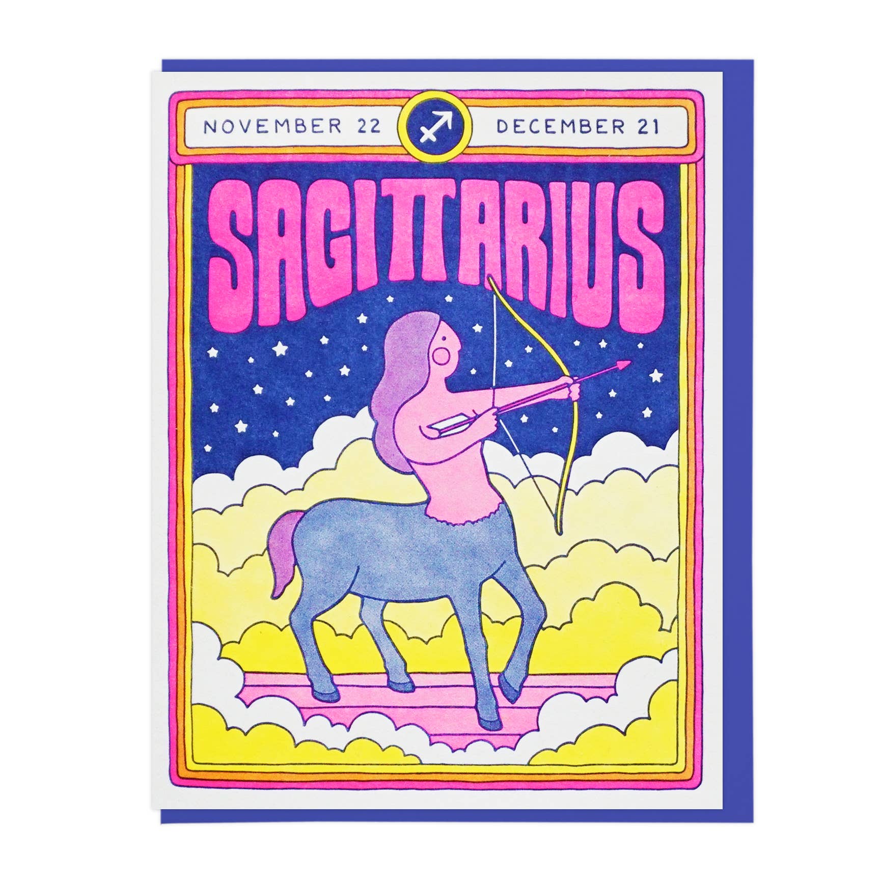 Embrace the art of giving with the Sagittarius Card from Lucky Horse Press. Imprinted with a unique letterpress finish, this card is perfect for celebrating any occasion. Crafted by designer Michele Lee, it embodies her love for color experimentation and inspiration drawn from music, memories, and irreverent things. This card is not just a greeting; it's a piece of art that spreads general happiness for all. Made in the Garden State studio, where creativity meets the charm of beaches, yard sales, and bowling alleys.