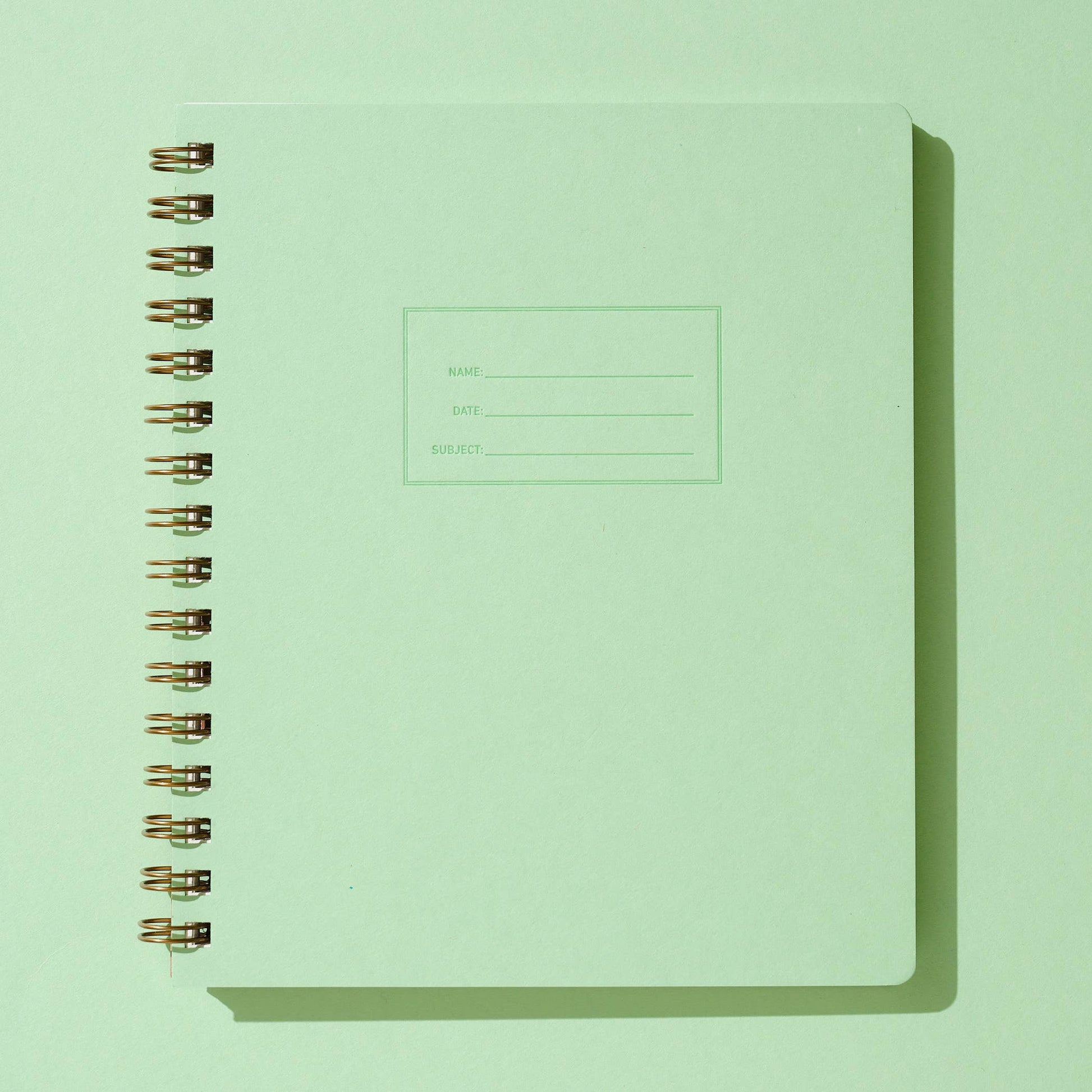 The Standard Notebook by Shorthand Press is truly a delight to use. With a letterpressed cover and beautiful interior pages, this notebook was designed, printed and assembled by hand in the US. Once you hold this notebook you'll never want anything else. - Mint cover with Emerald ink Name, Date, and Subject lines keep you organized and ready to conquer - Made with paper from renewable forests - Rounded corners help prevent bent pages when stuffed into a bag. Notebook lays open flat thanks to the beautiful gold wire-o binding - 160 interior pages available in lined, sketch, graph paper and dot grid - Dimensions: 7 X 8.5 X .5 Inches